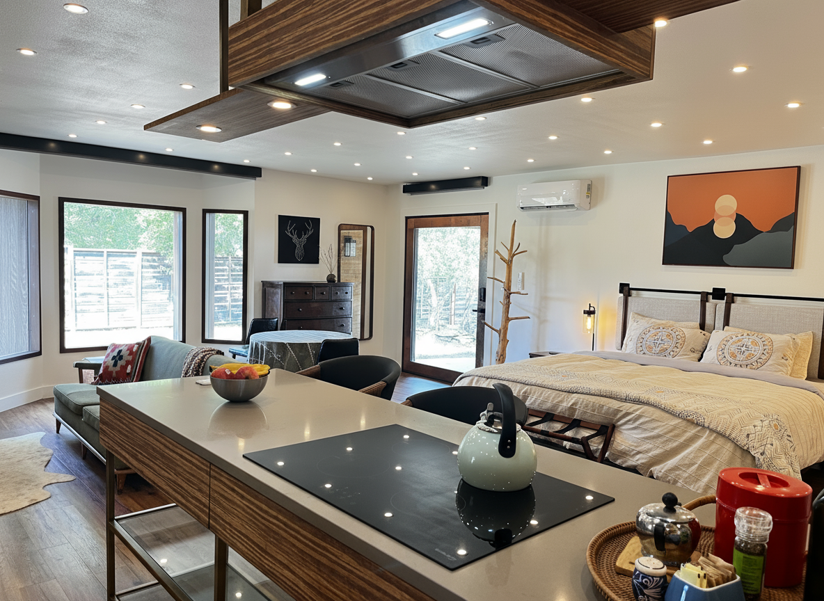 DRIFTWOOD, Texas Hill Country Designer Studio: Tucked away on a creatively inspired, safe, and gated property, a designer studio for anyone in transition, a traveling nurse, or just coming through the Texas Hill Country. A 25-minute drive to downtown Austin.